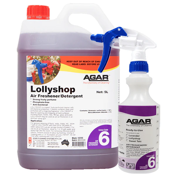 LOLLYSHOP is a strong deodorising detergent with the cleaning and germ-killing action needed to remove offensive and putrid soilage matter. After removing the source of the bad odour the perfume of LOLLYSHOP reodourises the surface with a pleasant lingering fragrance.