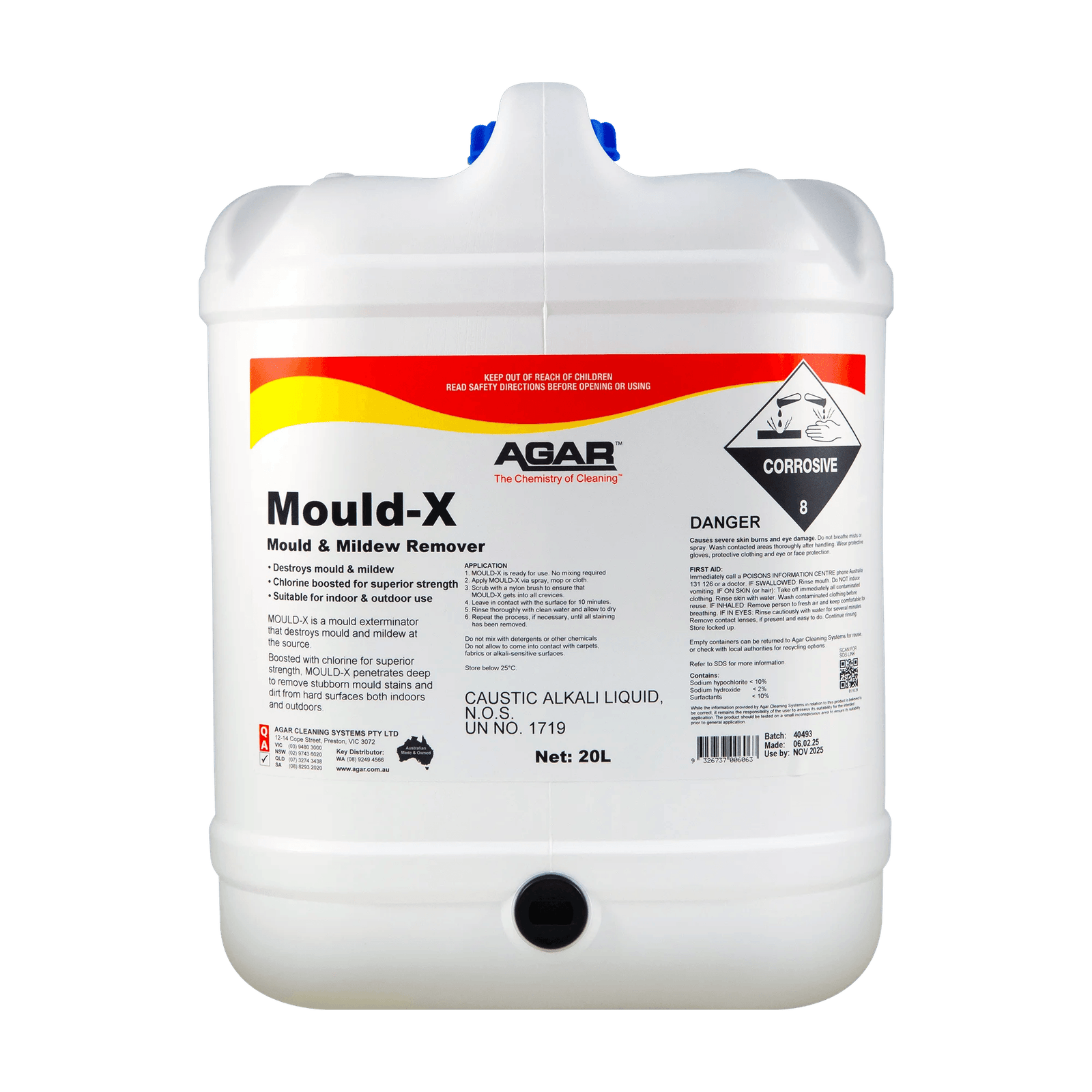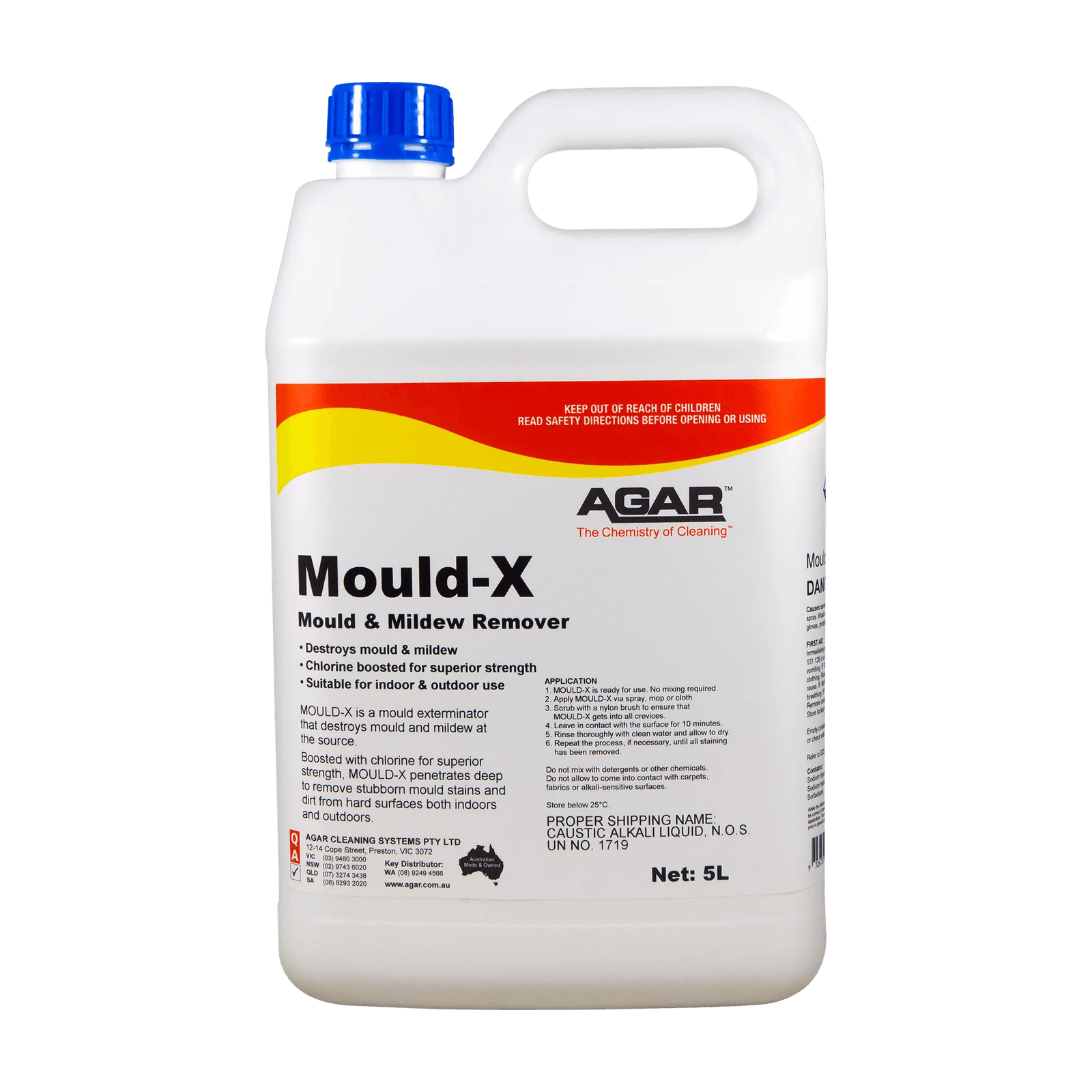MOULD-X contains available chlorine which is present in solution in the form of sodium hypochlorite and hypochlorous acid. Hypochlorous acid is a powerful germ-killing agent which kills mould and mildew. MOULD-X also contains caustic alkali and detergents to provide an excellent cleaning action.