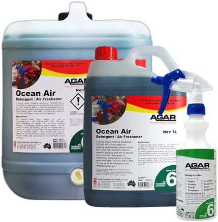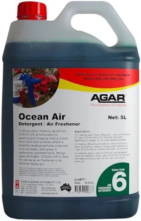 OCEAN AIR is a strong odour-masking deodoriser with a powerful cleaning action that leaves surfaces clean and perfumed with a pleasant fresh fragrance. OCEAN AIR is very good for treating offensive odours where a powerful residual perfume is required.