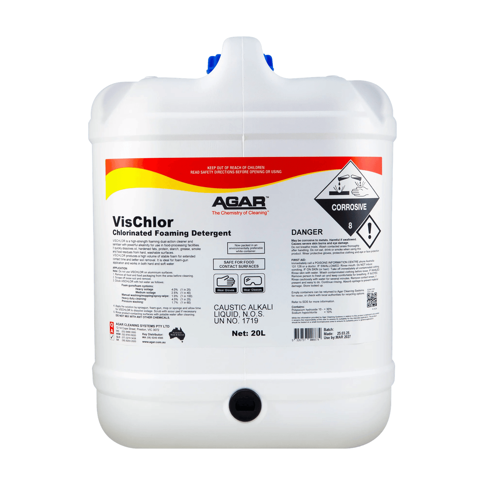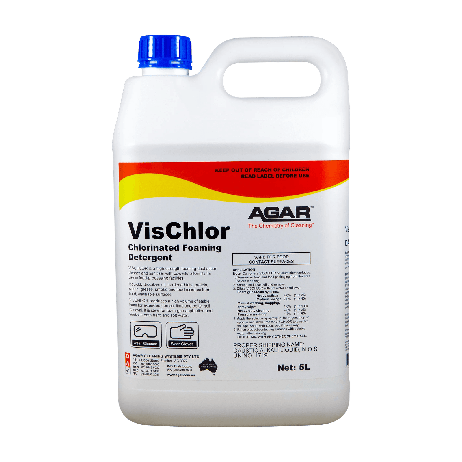 VISCHLOR contains available chlorine which kills bacteria, yeasts, mould and many viruses. It also contains caustic alkali and detergents to provide an excellent cleaning action. Removes cooking fats, vegetable oils, smoke films, carbon deposits, food spills, protein and other contamination found in food preparation areas, kitchens and abattoirs.