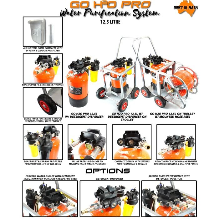 Plug-and-play GO H2O PRO deionisation system with 12.5L tank, 5 micron 7 inch carbon pre-filter and McLennan Head. Runs on tap pressure with no pumps or power. Optional trolley, multiple outlets, detergent dispenser, DI bypass and resin type selection.
