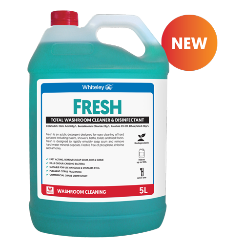 Whiteley Fresh Total Bathroom Cleaner rapidly cleans and disinfects showers, sink basins, tiles and toilets in one operation. It is fast acting, removes soap scum, dirt and grime, helps kill odour-causing bacteria, and is biodegradable.